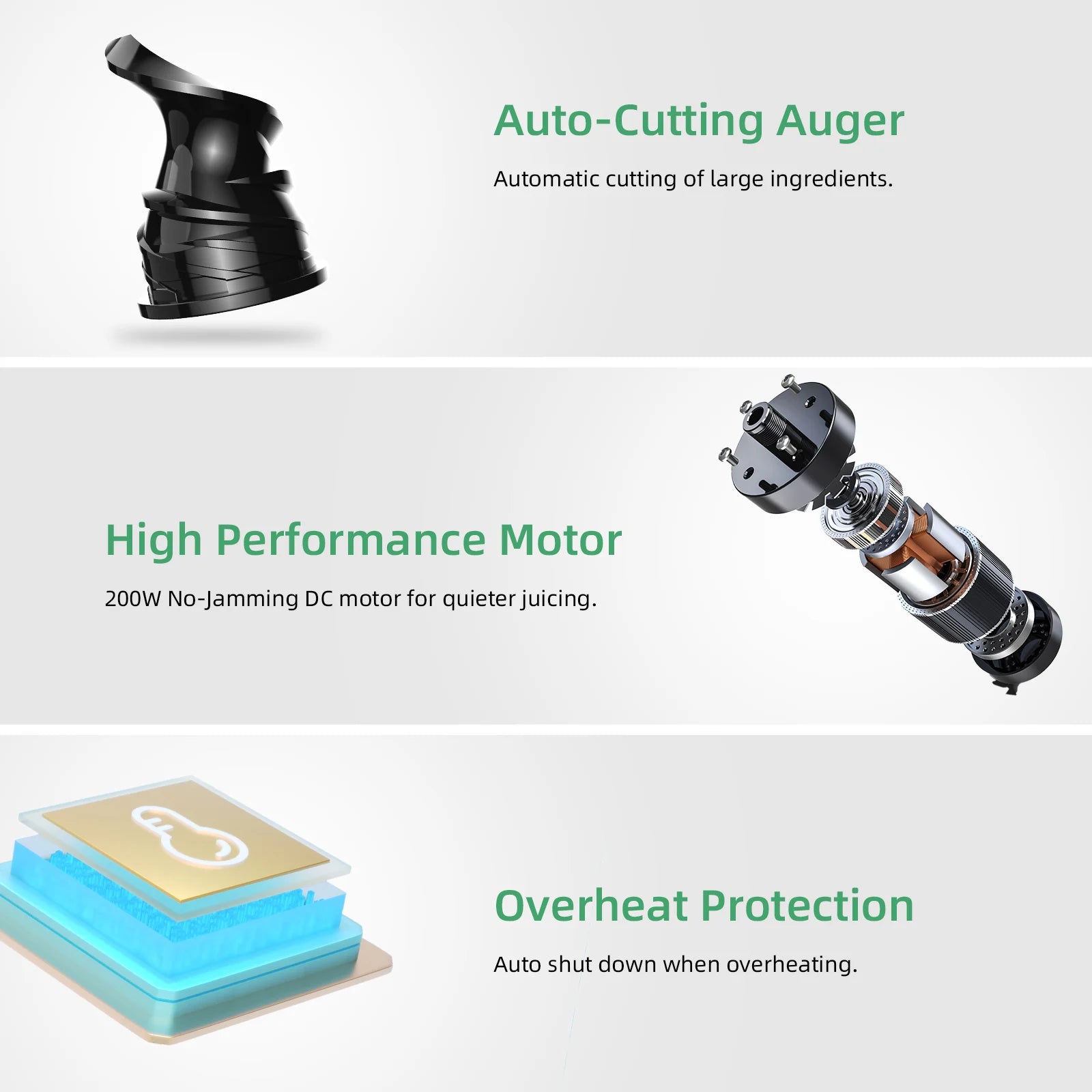 200W slow-press motor – maximizes juice yield with rich nutrients.